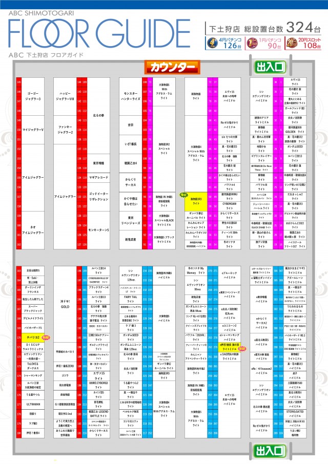 - 4パチ:126台 1000円/46枚スロ:108台 200円/180玉パチ:90台