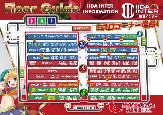 - ◆パチンコ各台計数パーソナルシステム設置 ◆全台快適肘置き付きチェア ◆店内快適無料インターネット「Wi-Fi」 ◆携帯電話・スマートフォン充電器貸し出し ◆貯玉/再プレーシステム導入 ◆新型コロナウイルス感染防止対策強化