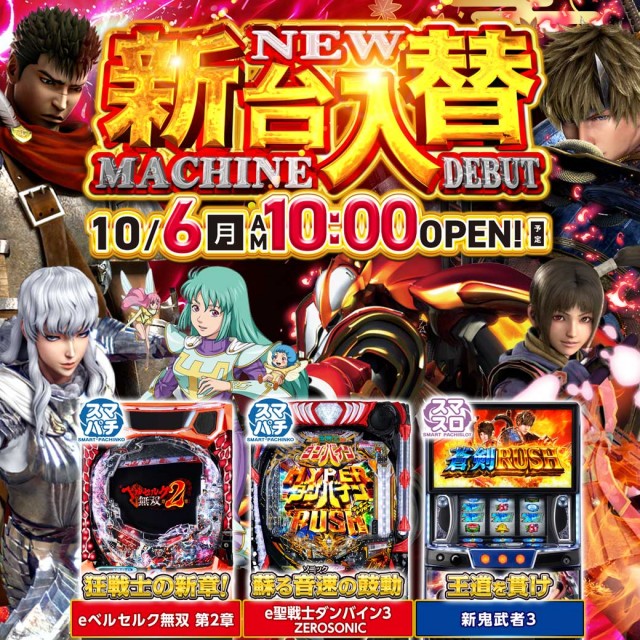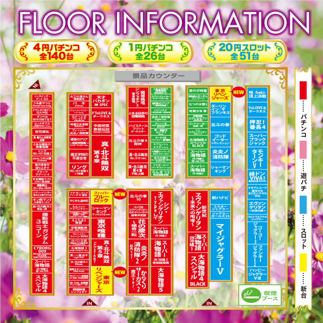 - H28 6月24日・グランドリニューアルオープン!! 各台計数機を設置して、会員カードも導入いたしました。 皆様に長時間快適にご遊技いただけるよう、イスやトイレなども 設備面も全面改装いたしました。 無料Wi-Fiもご利用いただけます。 皆様のご来店をお待ちいたしております。