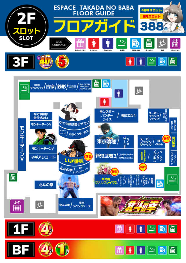 - 4円パチンコ:310台 1円パチンコ:142台 1000円=46スロ:334台5円スロット54台