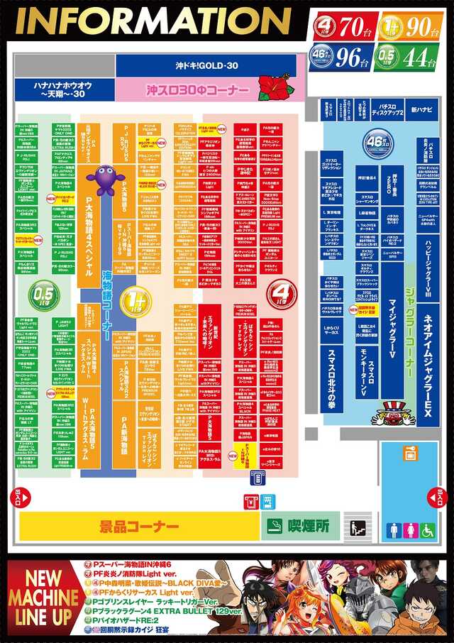 - パチンコ:[4]70台[1.25]90台[0.5]44台 パチスロ:[46]96台