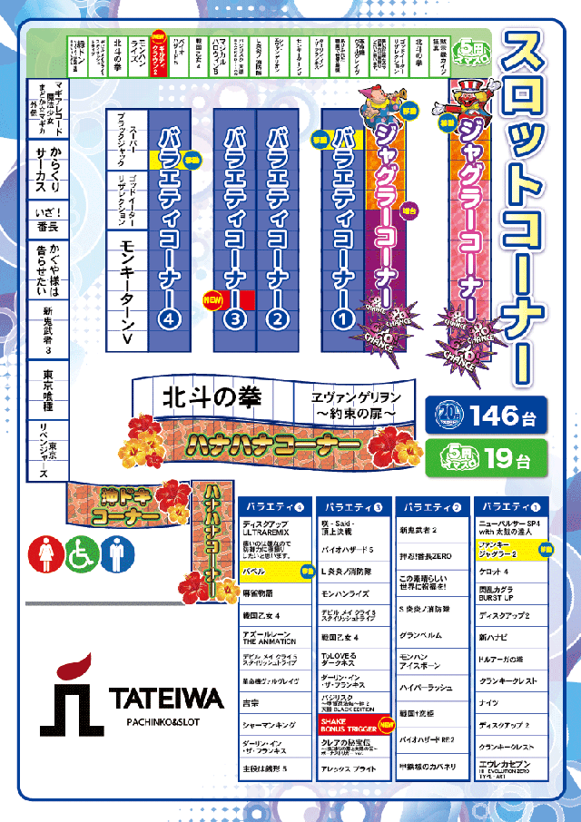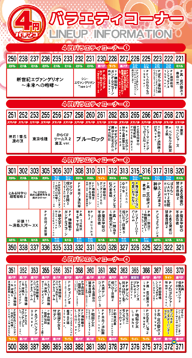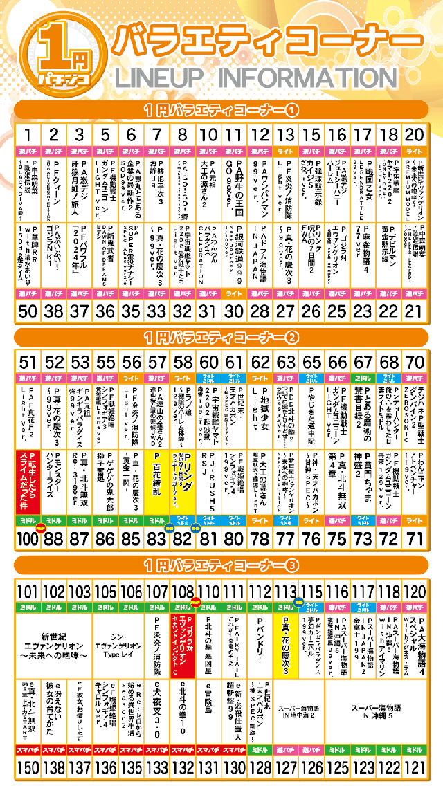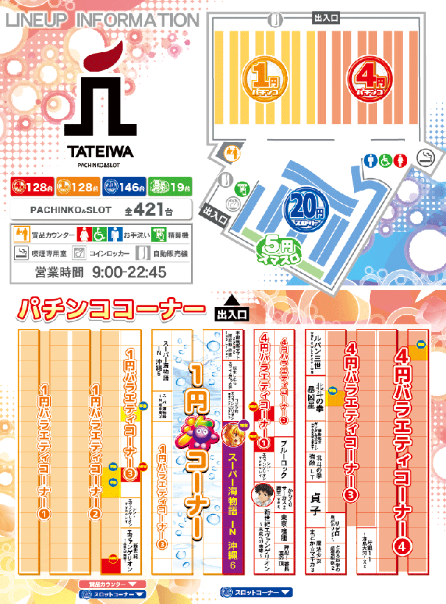 - [1000円/250玉]パチ:128台 [200玉/200]パチ:128台 [1000円/50枚]スロ:146台 [1000円/200枚]スロ:19台