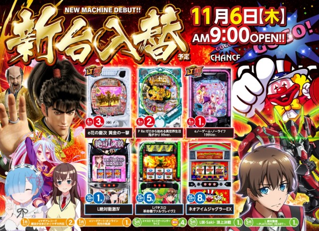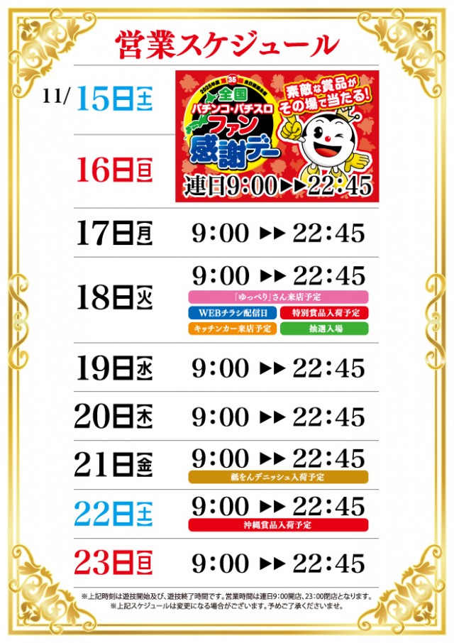 - 年中無休(新台入替前日はお休みさせて頂くことがございます)