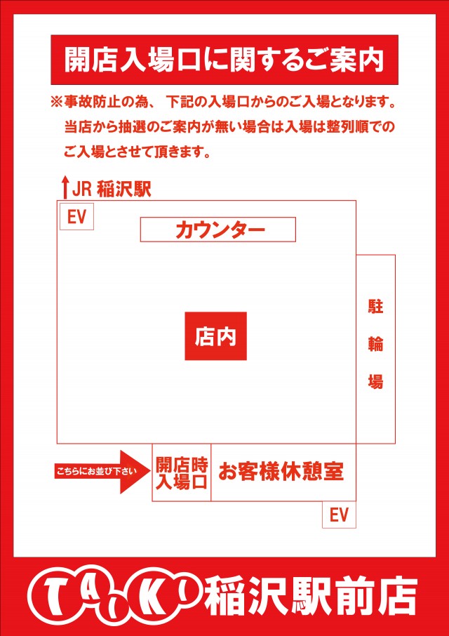 - ※当店からの抽選のご案内が無い場合、店舗正面入り口にて並び順入場とさせていただきます。