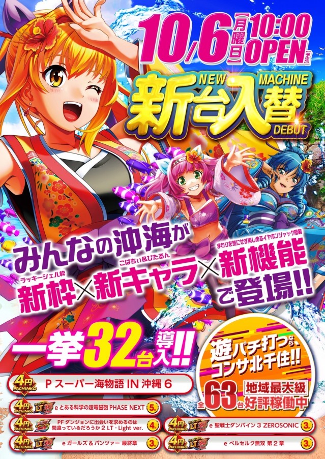 - パチンコ:500円/125玉:396台 200円/178玉:178台 パチスロ:1000円/47枚スロ:398台 1000円/186枚スロ:63台