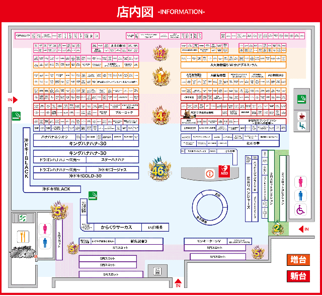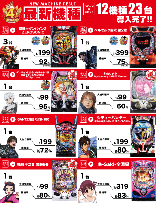 - [4]パチ:152台 [0.2]パチ:126台 [1]パチ:198台 [1000円/46枚]スロ:341台 [2]スロ:32台 [5]スロ:69台