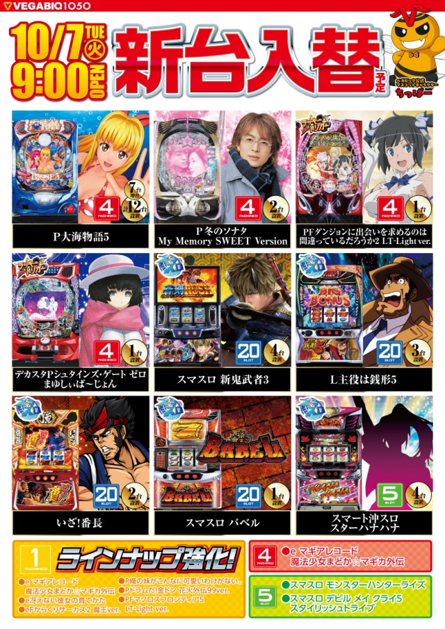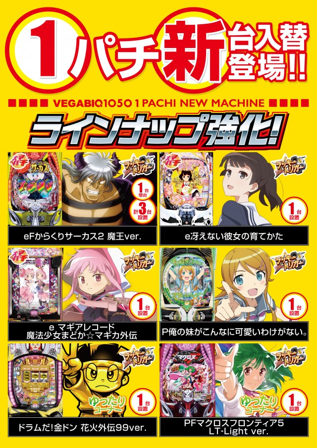 - パチンコ:506台 スロット:454台 総設置台数:960台 スタッフ一同「全 力 営 業」でお待ち致しております。