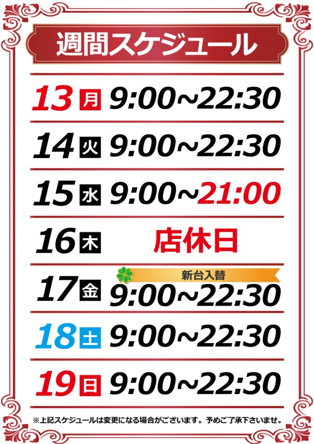 - 年中無休(入替オープン前日は検査のためお休みさせていただきます)