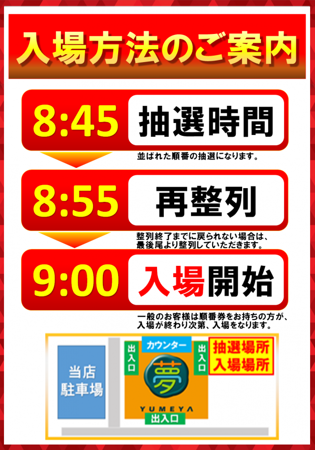 - 朝8:45より抽選開始 8:55に再整列をお願い致します。