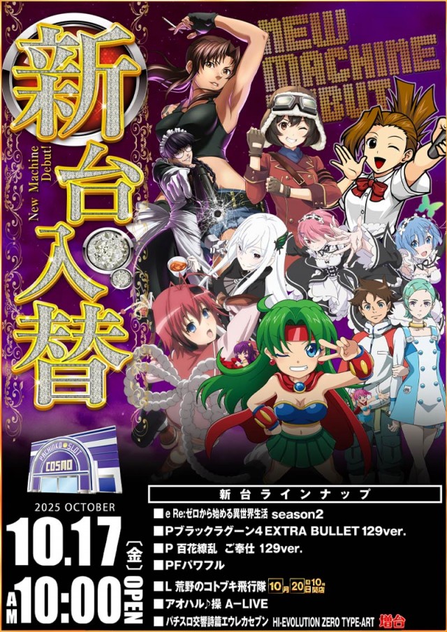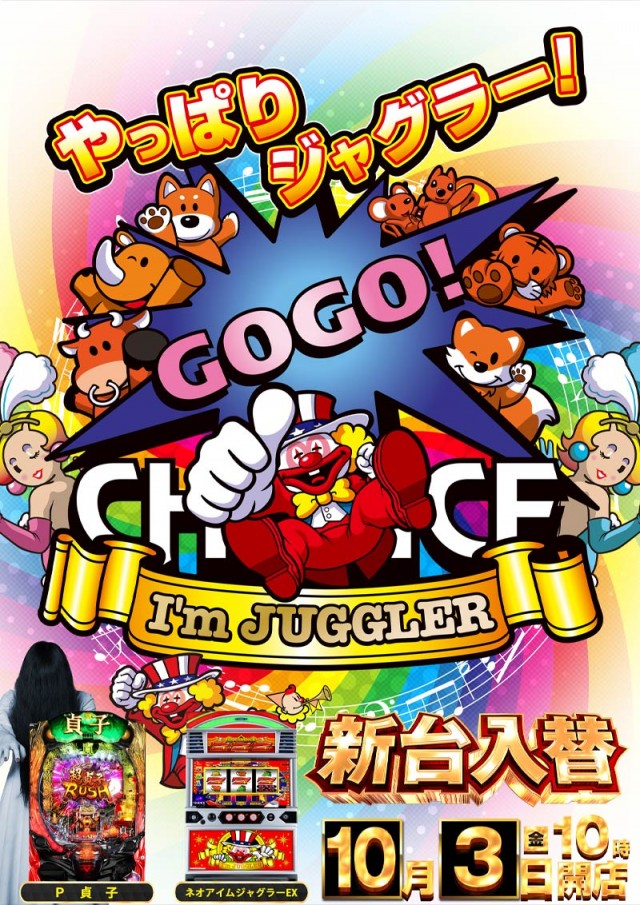 - リニューアルオープン・新台入替初日等場合により変更有。 9:45までに並ばれている お客様を対象に抽選。(5名様未満の場合先着順にて整理券配布)