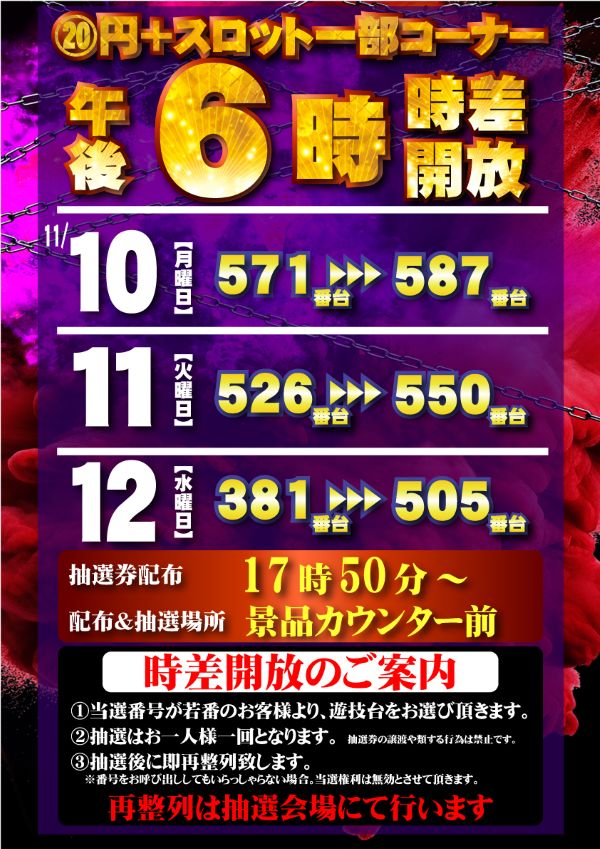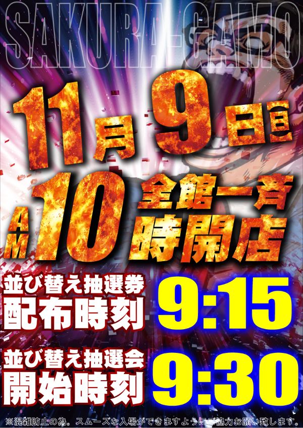 - 09:30 並び替え抽選券配布 09:45 並び替え抽選開始 09:55 再整列 10:00 入場開始 (各時刻に関しましては、諸事情により変更となる場合がございます。その際は当店ブログにてご案内いたします)