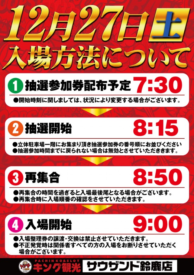 - 朝8:40より立体駐車場1Fにて並び替え抽選を行います。