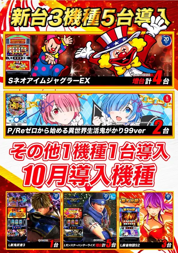 - [4]パチ:160台 [1]パチ:120台 [0.5]パチ:40台 [1000円/46枚]スロ:120台 [5.6]スロ:40台