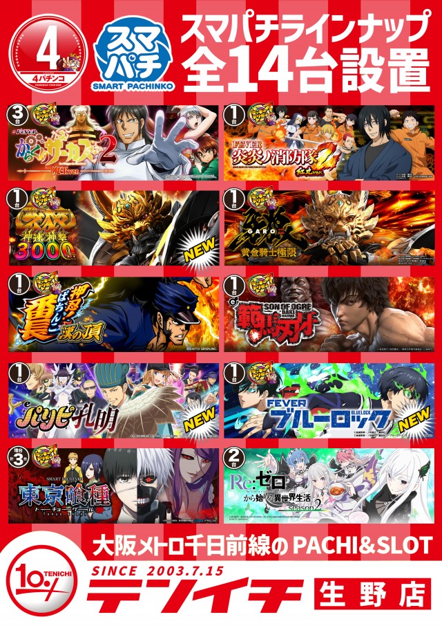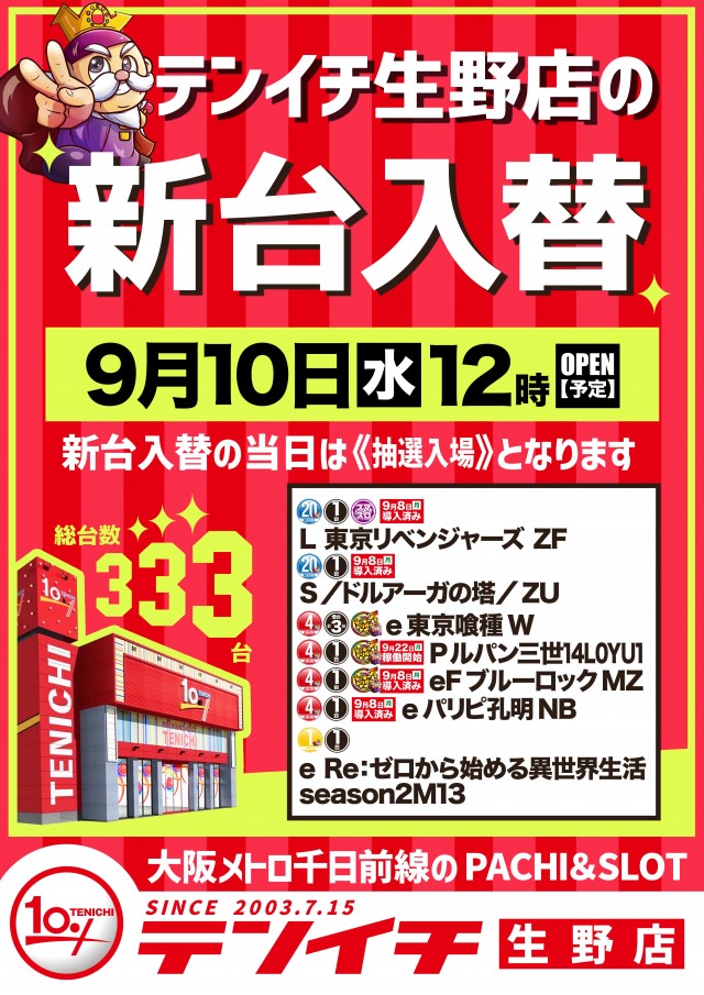 - 総台数 【333台】 4円パチンコ 112台 1円パチンコ 112台 20円スロット 109台 【テンイチ生野店】です♪♪ 最寄駅まで徒歩10秒!! 女性スタッフ多数活躍中!!