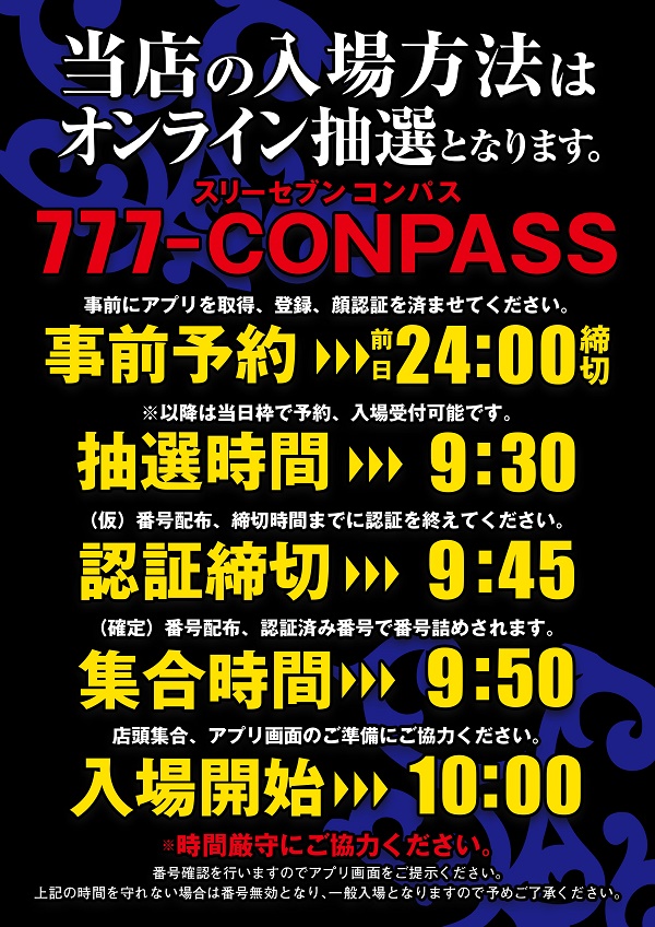 - 『777CON-PASS』によるオンライン抽選を利用しております。詳細につきましてはアプリにてご確認ください。