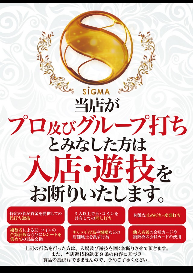 - お客様に最高のサービスを提供し続けるために最高の笑顔と 感謝のこころを持ってお出迎え致します。 シグマ本店で楽しいひと時をお過ごし頂けたらと思います!! 皆様のご来店をスタッフ一同心よりお待ち致しております。