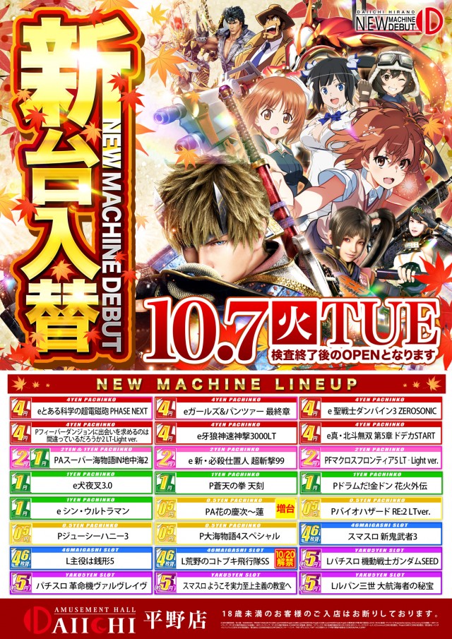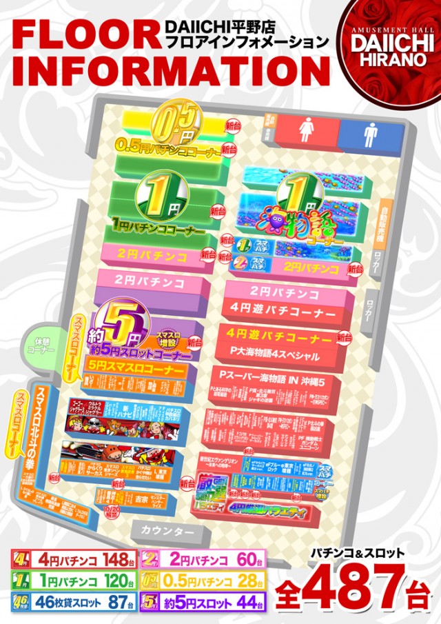 - [4]パチ:148台 [0.5]パチ:28台 [2]パチ:60台 [1]パチ:119台 [1000円/46枚]スロ:87台 [1000円/184枚]スロ:44台