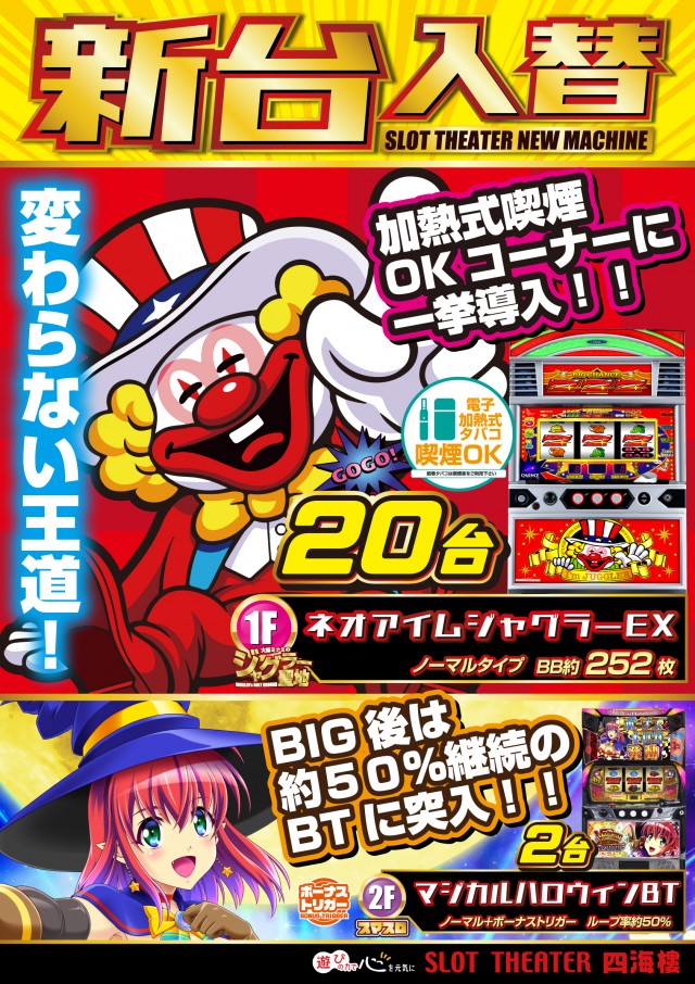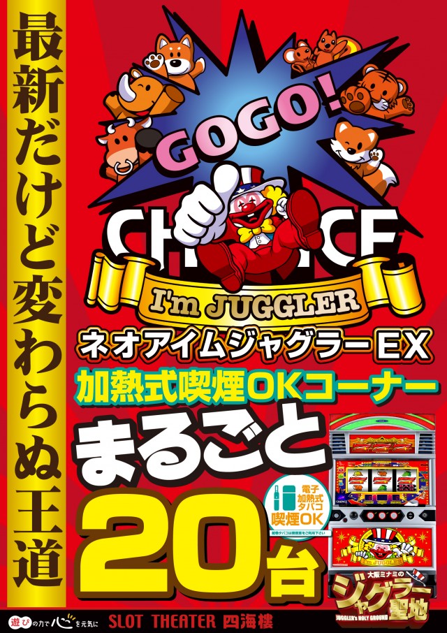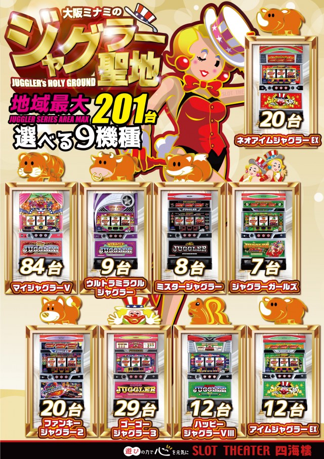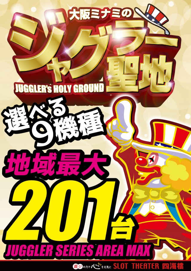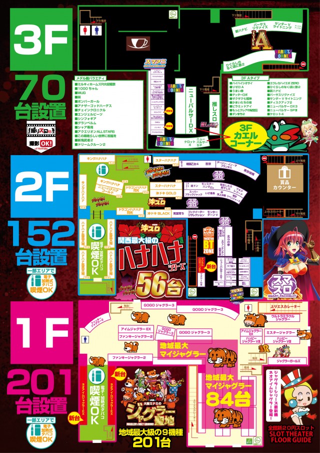 - 1階はジャグラーシリーズ関西最大級専門フロアで173台設置!2階は最新&定番機種や沖スロ設置。賞品カウンターも2階にございます。3階はバラエティ♪ジャグラーを愛して24年♪1998年創業の老舗スロット専門店です。