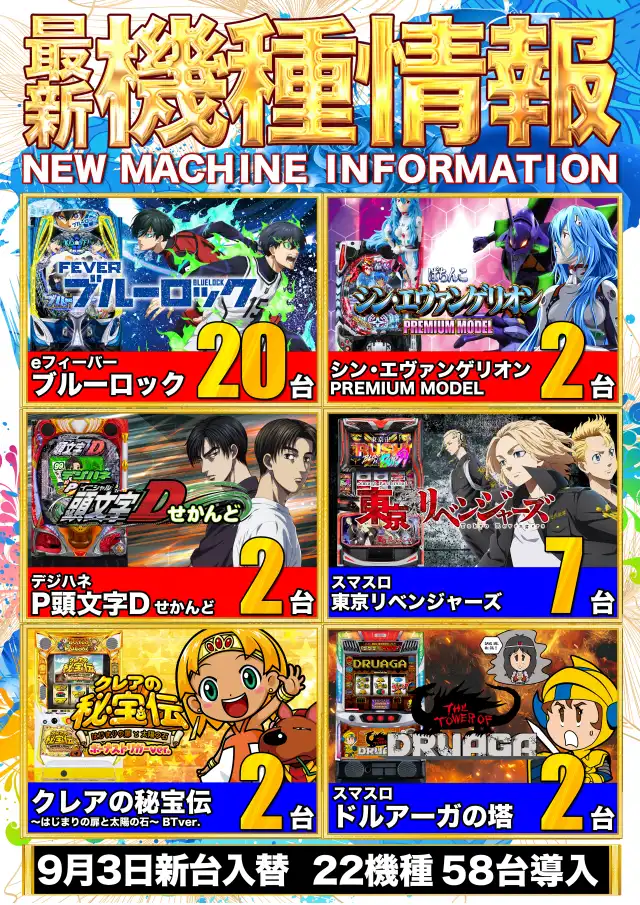 - 新台入替前日は検査の為、お休みを頂く場合がございます。