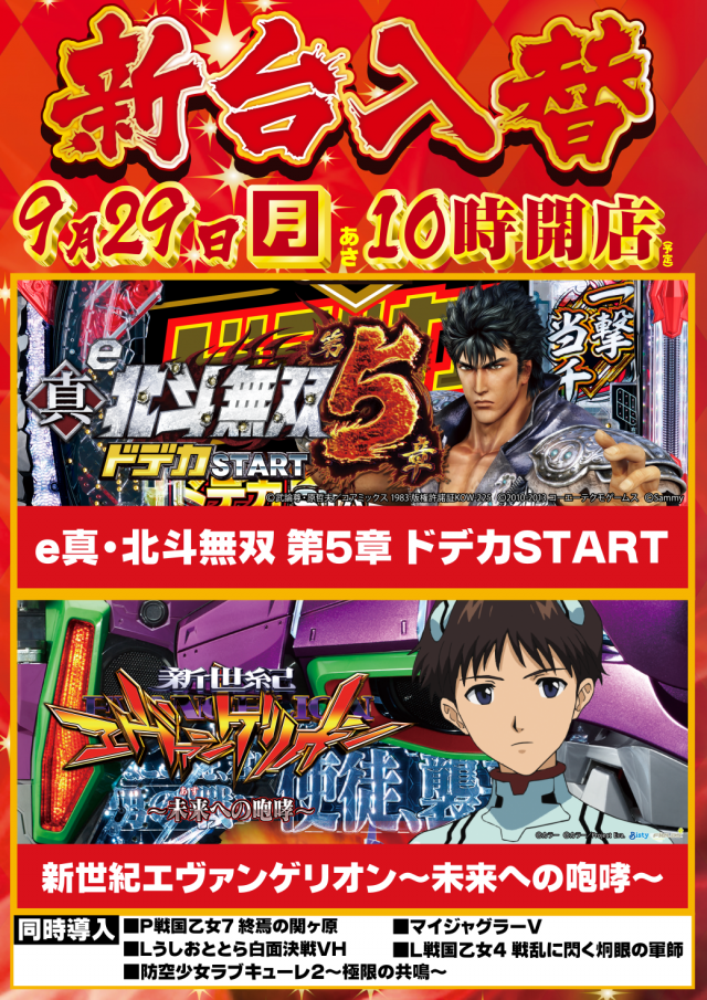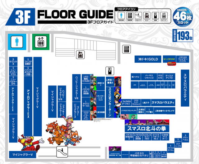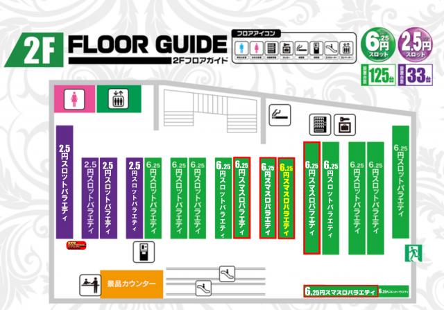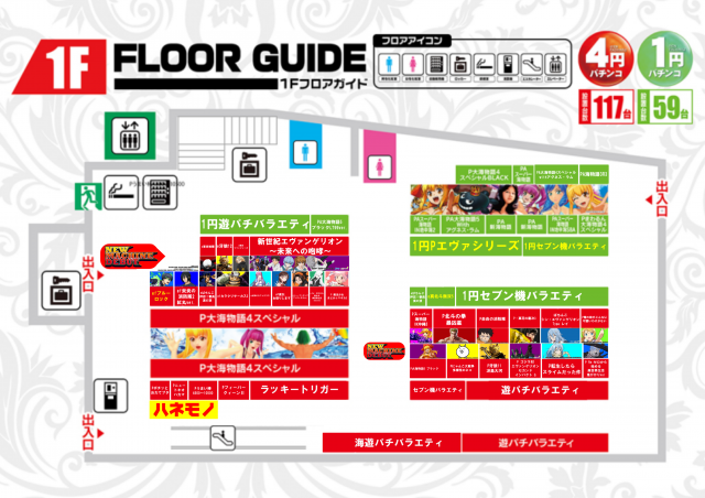 - [4]パチ:117台 [1]パチ:59台 [1,000円/160枚]スロ:125台 [1000円/46枚]スロ:193台 [2.5]スロ:33台