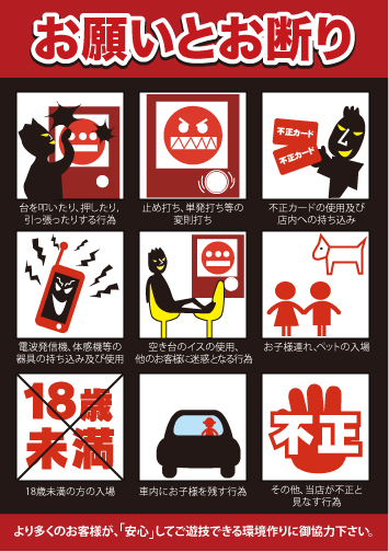 - ★会員システム★ 【全貯玉が可能】 (貯玉・貯メダル無制限) 【来店ポイントサービス】 ご来店毎にポイントが貯まります。 ★ひざ掛け貸出サービス★ ★無料冷蔵コインロッカー完備★ ★無料コインロッカー完備★ ★屋内喫煙室★