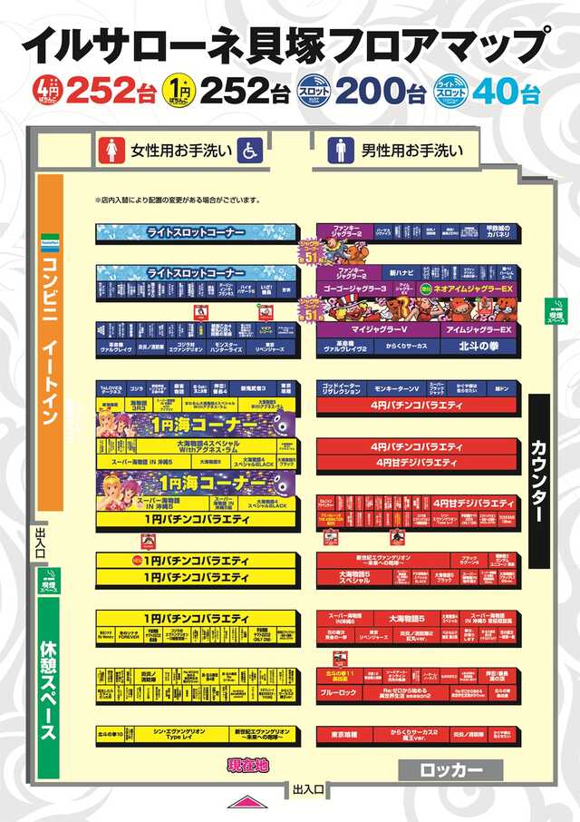 - [1]パチ:252台 [4]パチ:252台 [1000円/46枚]スロ:200台 [1000円/184枚]スロ:40台