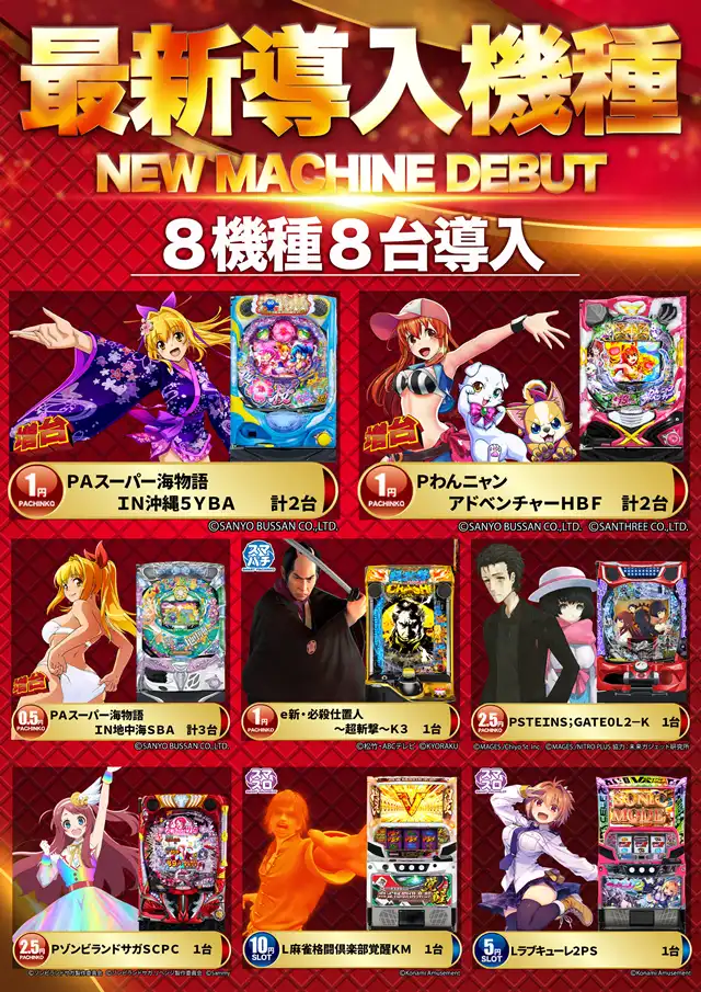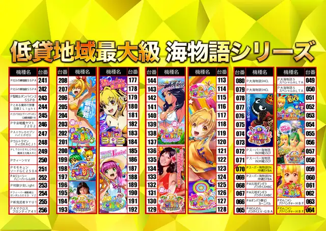 - パチンコ 【2.5円】32台 【1円】208台 【100円178玉】32台 スロット 【1000円89枚】43台 【1000円178枚】85台
