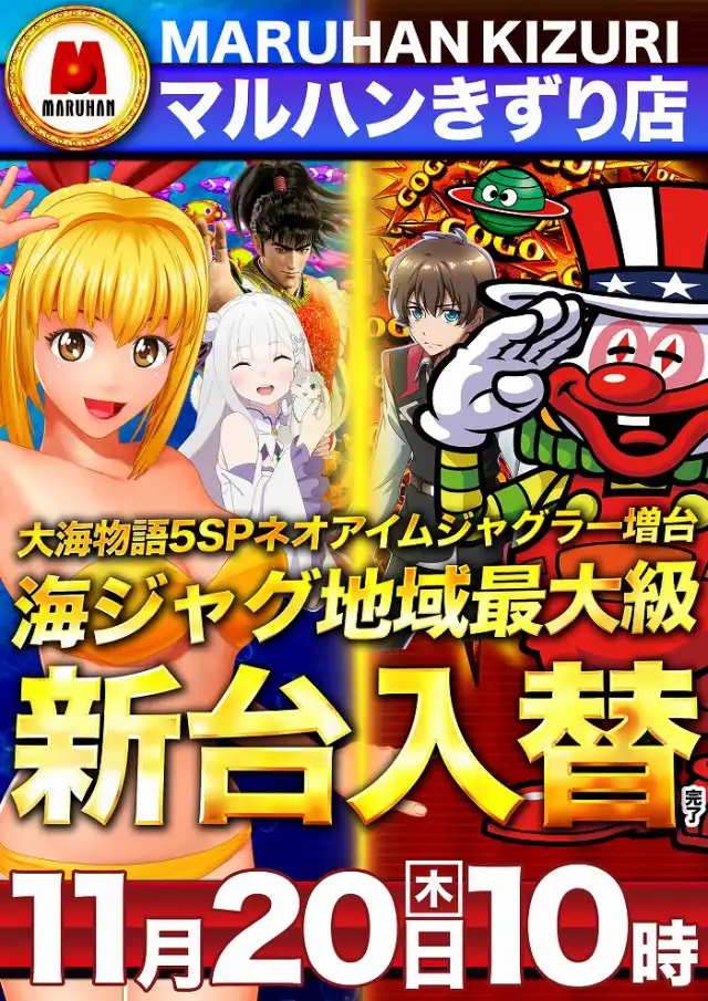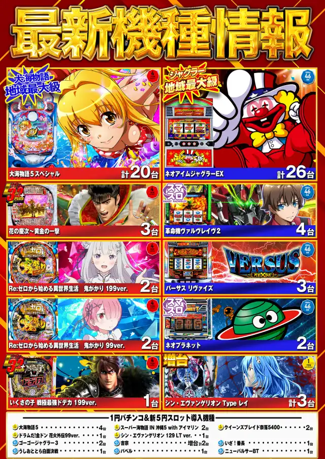 - 4円パチンコ:240台 1円パチンコ:80台 1000円/46枚スロット:120台 1000円/184枚スロット:40台