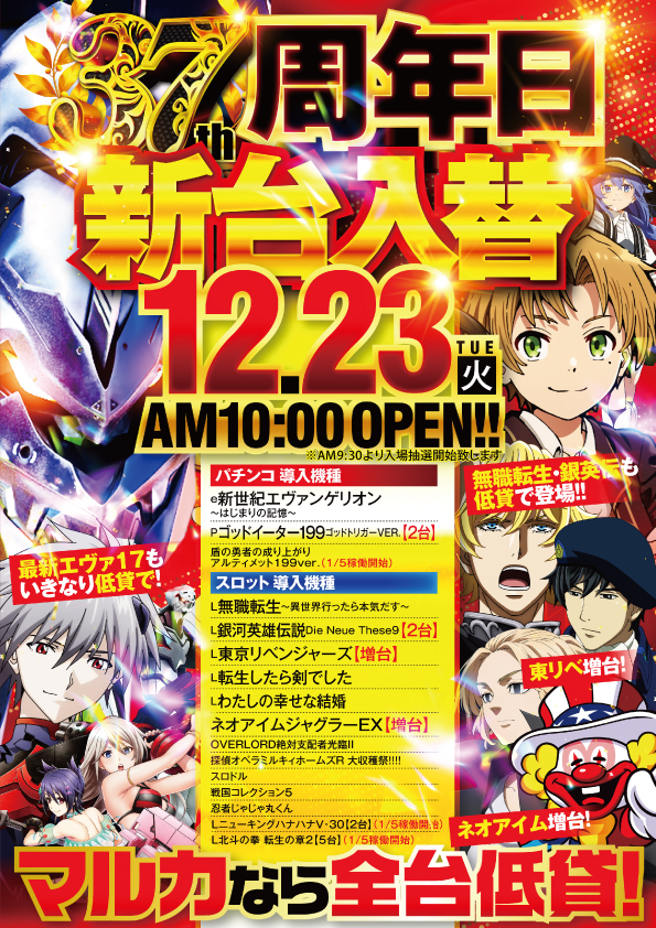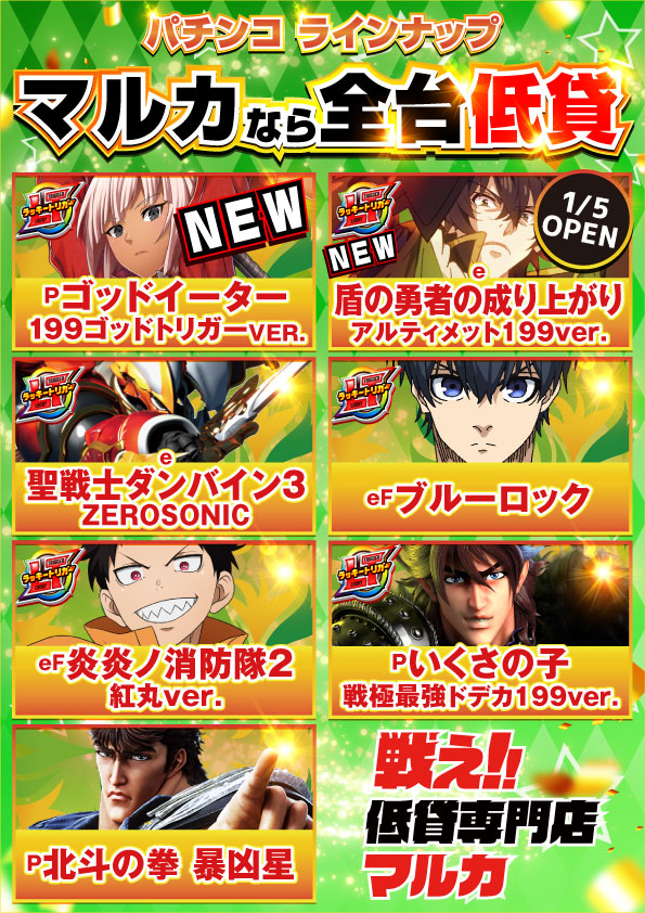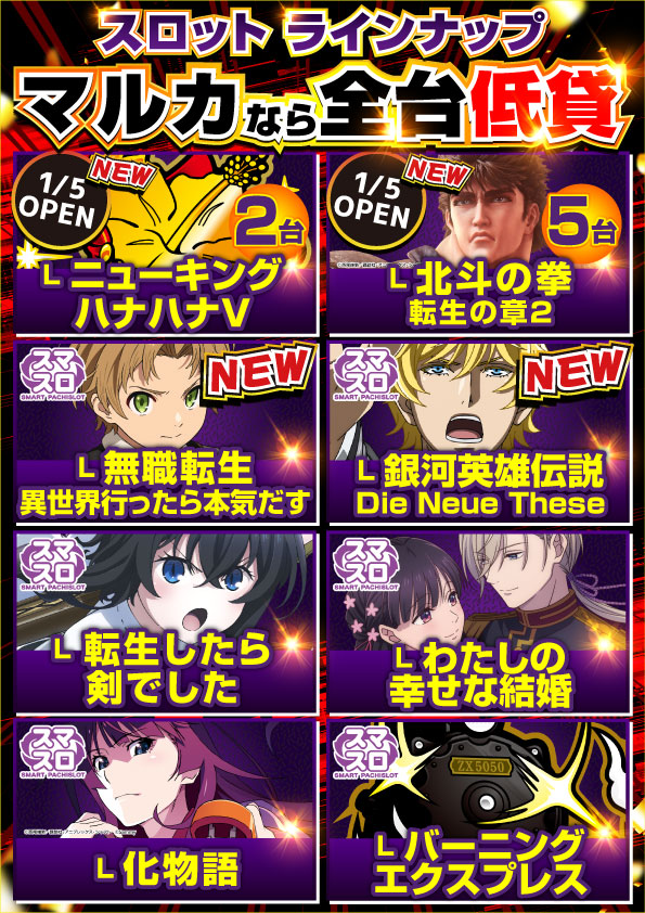 - [パチ] 1パチ/160台 2パチ/31台 計191台 [スロ] 10スロ/102台 5スロ/102台 計204台