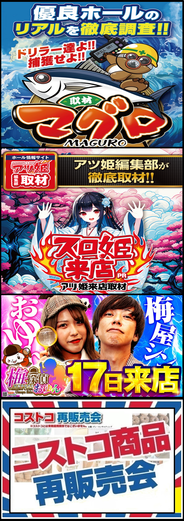 - [4]パチ:232台 [1]パチ:104台 [1000円/46枚]スロ:258台 [5]スロ:59台