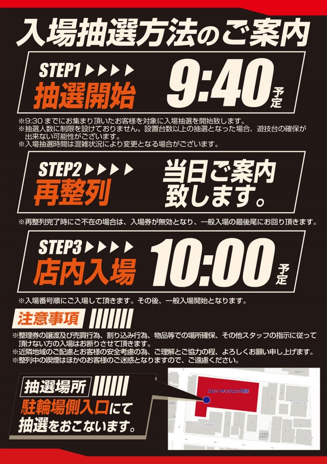 - 9:40~シャッフル抽選開始 9:50~再整列 10:00~入場