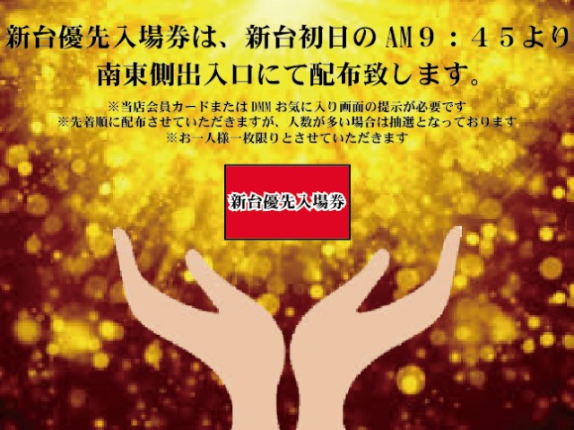 - 新台入替当日朝9:45正面入口にて整理券を配布します!(申し込み多数の場合抽選となります)