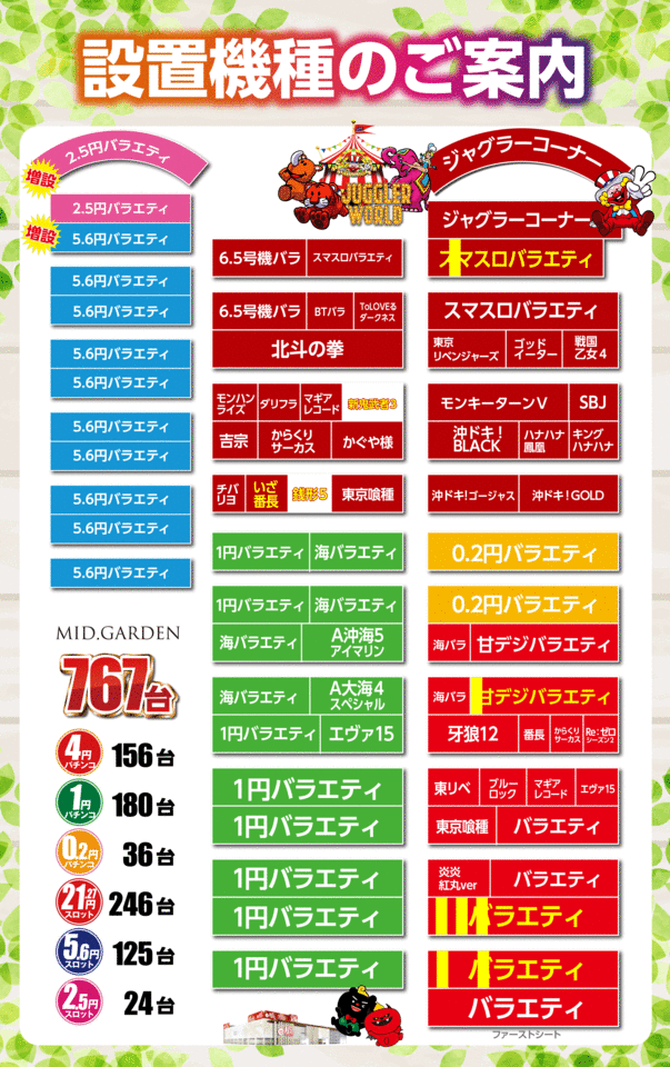 - [4]パチ:156台 [1]パチ:180台 [0.2]パチ:36台 [1000円/47枚]スロ:246台 [2.5]スロ:18台 [1000円/178枚]スロ:107台