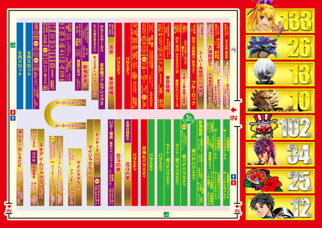 - パチンコ機 4円/1玉:298台 1.25円/1玉:178台 パチスロ機 1000円/46枚:357台 5円/1枚:29台