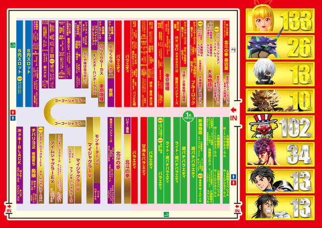 - パチンコ機 4円/1玉:298台 1.25円/1玉:178台 パチスロ機 1000円/46枚:357台 5円/1枚:29台