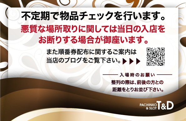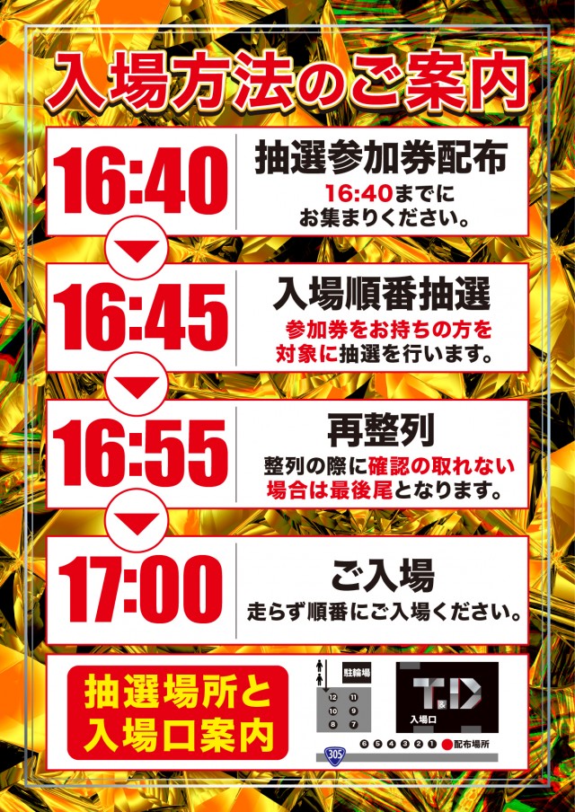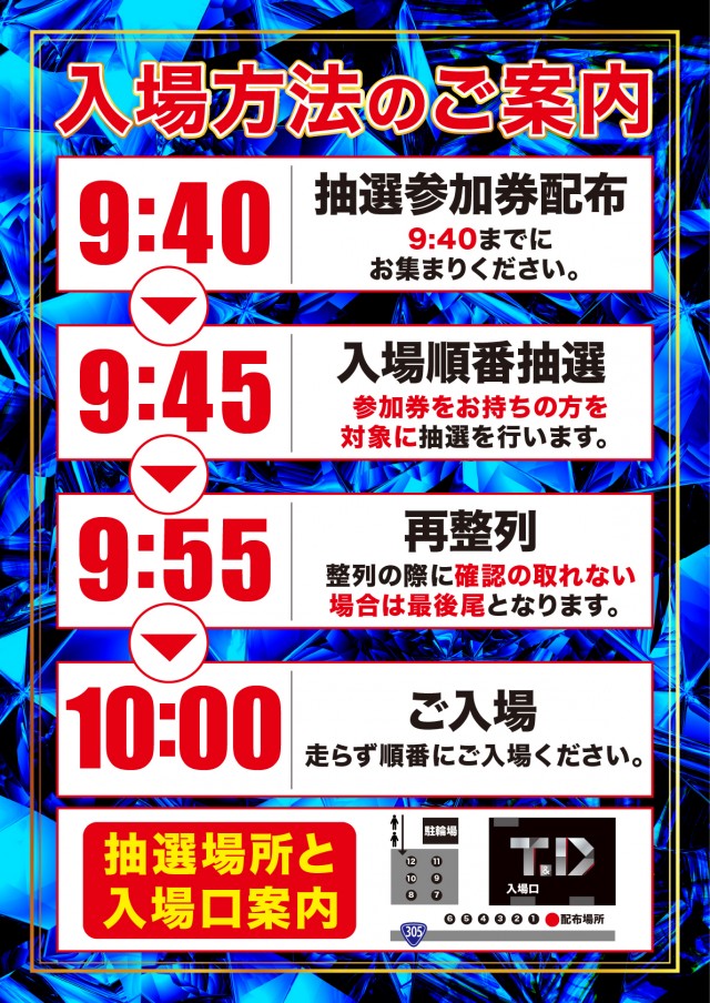 - 朝、9時40分より抽選参加券配布→9時45分抽選開始 ※17時開店予定の場合は16時40分より配布