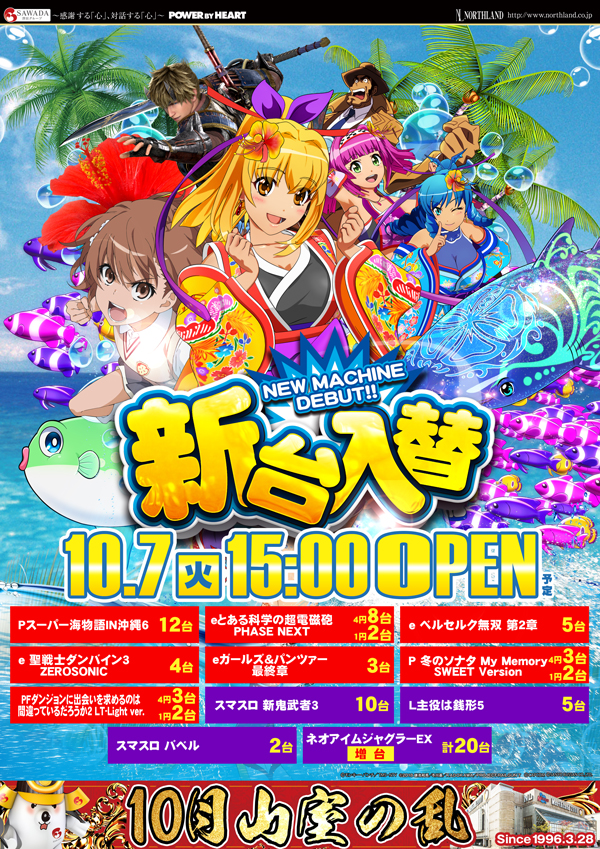 - [0.5]パチ:64台 [1]パチ:383台 [4]パチ:464台 [1000円/46枚]スロ:428台 [1000円/180枚]スロ:64台 [500円180枚貸し]スロ:32台