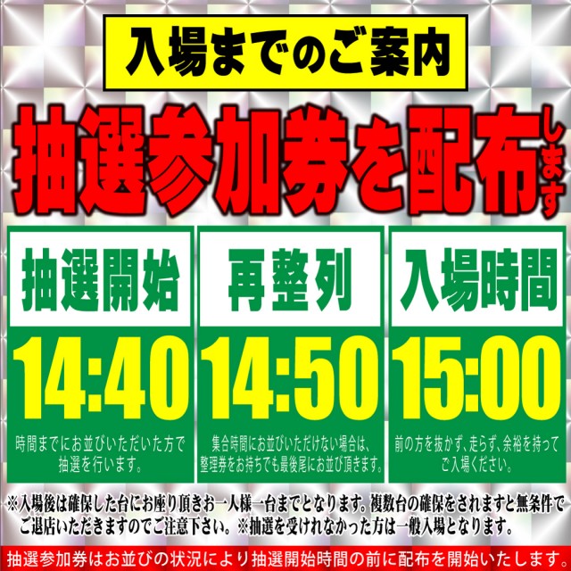 - 8:40に抽選開始、9:00入場予定となります。