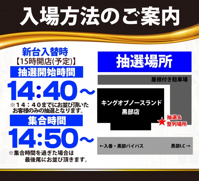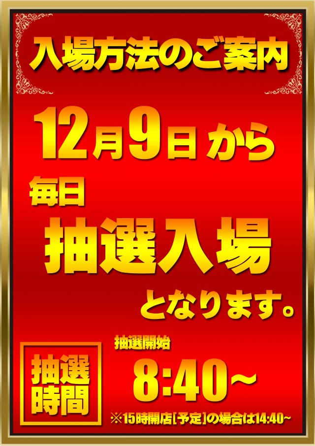 - 土日祝及び新台入替15時開店時のみ抽選入場となります