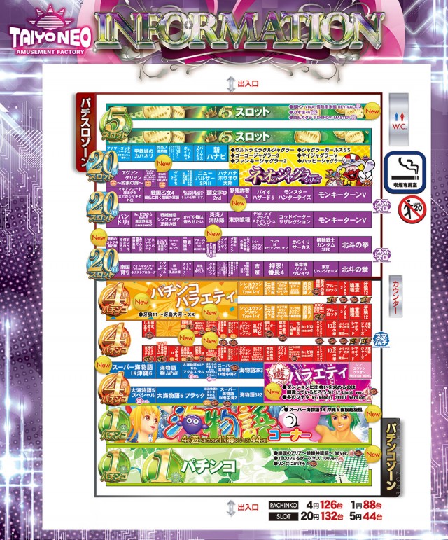 - [4]パチ:126台 [1]パチ:88台 [1000円/46枚]スロ:132台 [1000円/184枚]スロ:43台