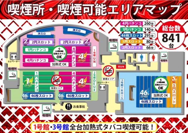 - パチンコ全台、各台計数機完備でラクラク台移動!! パチンコもスロットも加熱式タバコ使用可能フロアあり!