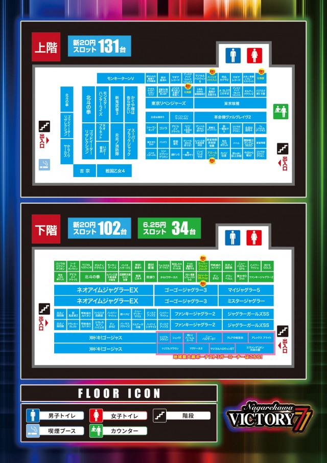 - スロット 【新20円スロット】(1000円で46枚)233台 【6.25円スロット】(1000円で160枚)34台