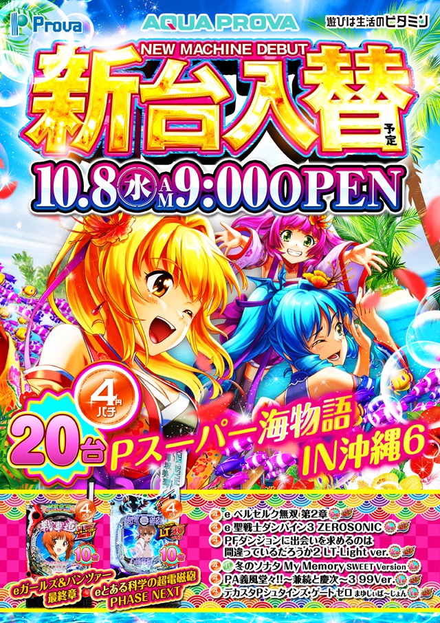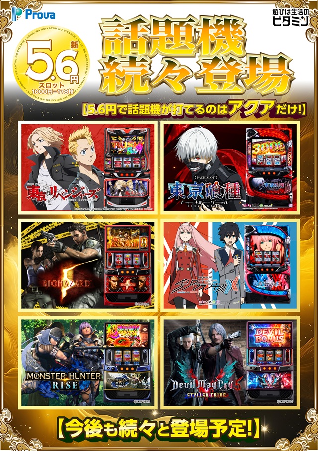 - 4円パチンコ:360台 1.1円パチンコ:120台 46枚スロット:435台 5.6円スロット:41台 合計956台