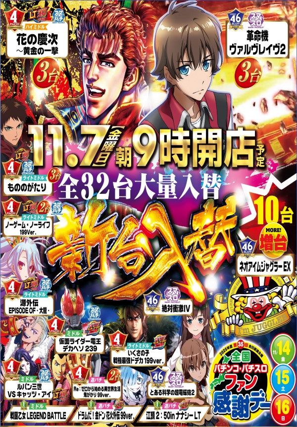 - [4]パチ:252台 [1]パチ:72台 [1000円/181枚]スロ:36台 [1000円/46枚]スロ:240台