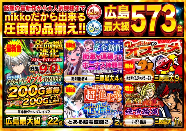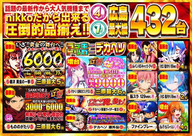 - ご覧いただきありがとうございます。 全レート合計広島最大級1005台設置⭐ ニッコーだからできる圧倒的品揃えでお客様のご来店をお待ちしています‼