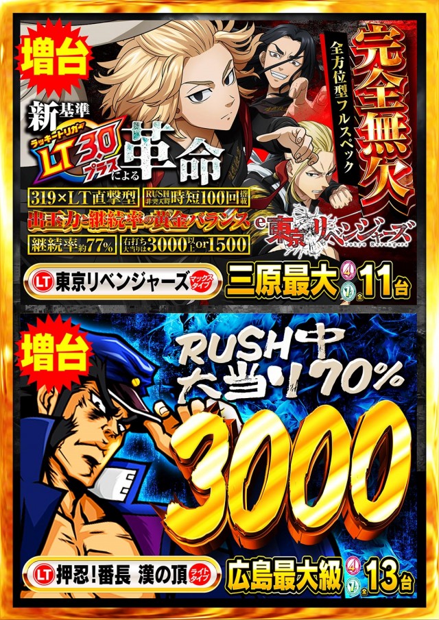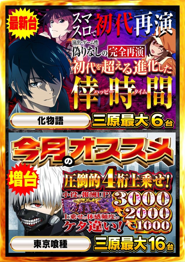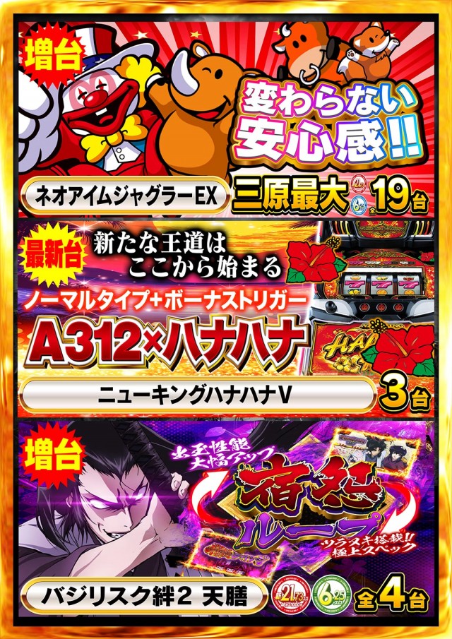 - 4パチ:252台 1.1パチ:180台 新20スロ537台 6.25スロ36台