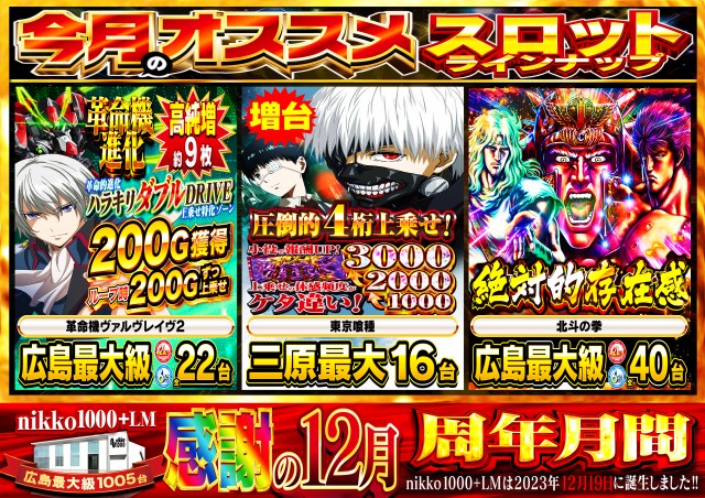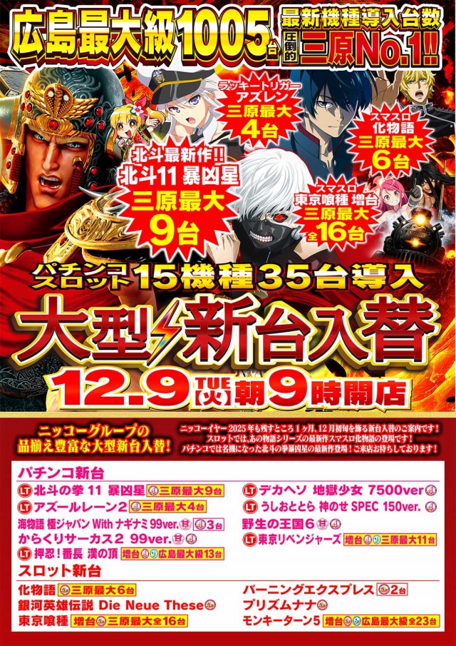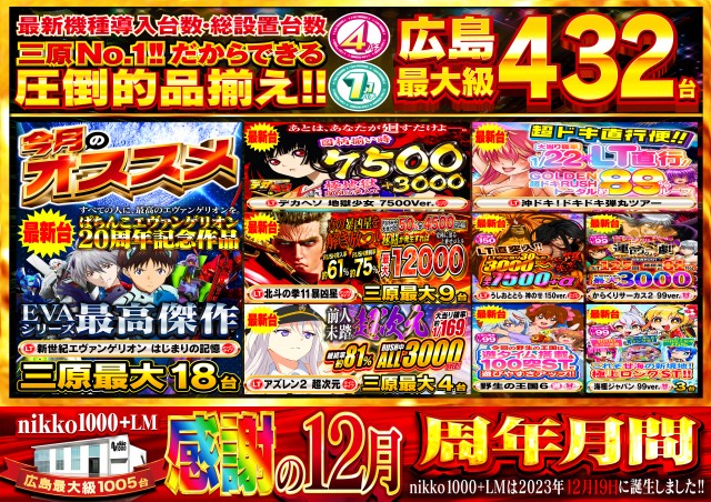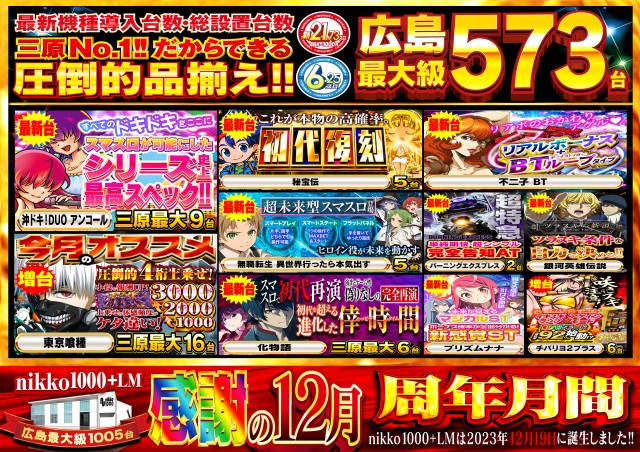 - ご覧いただきありがとうございます。 全レート合計広島最大級1005台設置⭐ ニッコーだからできる圧倒的品揃えでお客様のご来店をお待ちしています‼