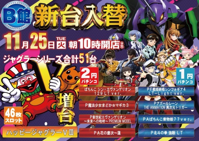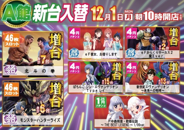 - [4]パチ:176台 [1.25]パチ:57台 [1]パチ:117台 [2]パチ:50台 [1000円/46枚]スロ:164台 [1000円/200枚]スロ:18台