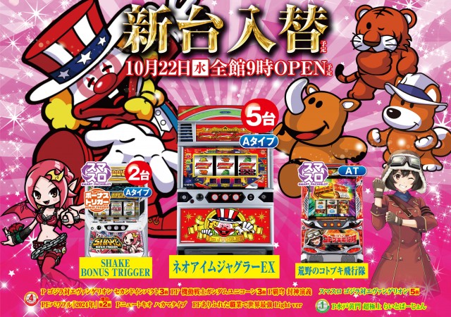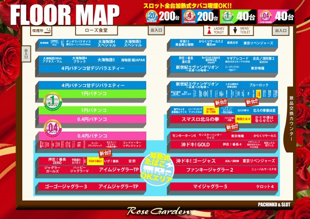 - ★会員システム 会員カードをご利用なら、さらに快適にご遊技できます。 ★パチンココーナー全台各台計数機設置 移動や交換もラクラク。より遊びやすくなりました。 ★スロットコーナーBiGMO設置 大画面でみやすく、充実機能で快適にご遊技できます。 ★無料コインロッカー設置