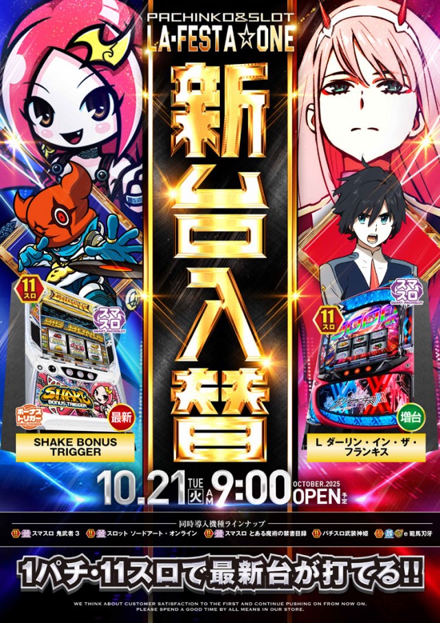 - ☆11スロ広島県最大設置台数☆ ★全席禁煙&パチンコ全台各台計数&Wi-Fi完備で遊技が更に快適★ 【1.1パチ】【11スロ】【5.5スロ】のお店です(/・ω・)/